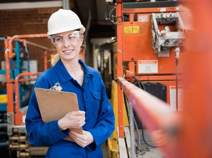 técnico verificando uma prancheta no interior da fábrica